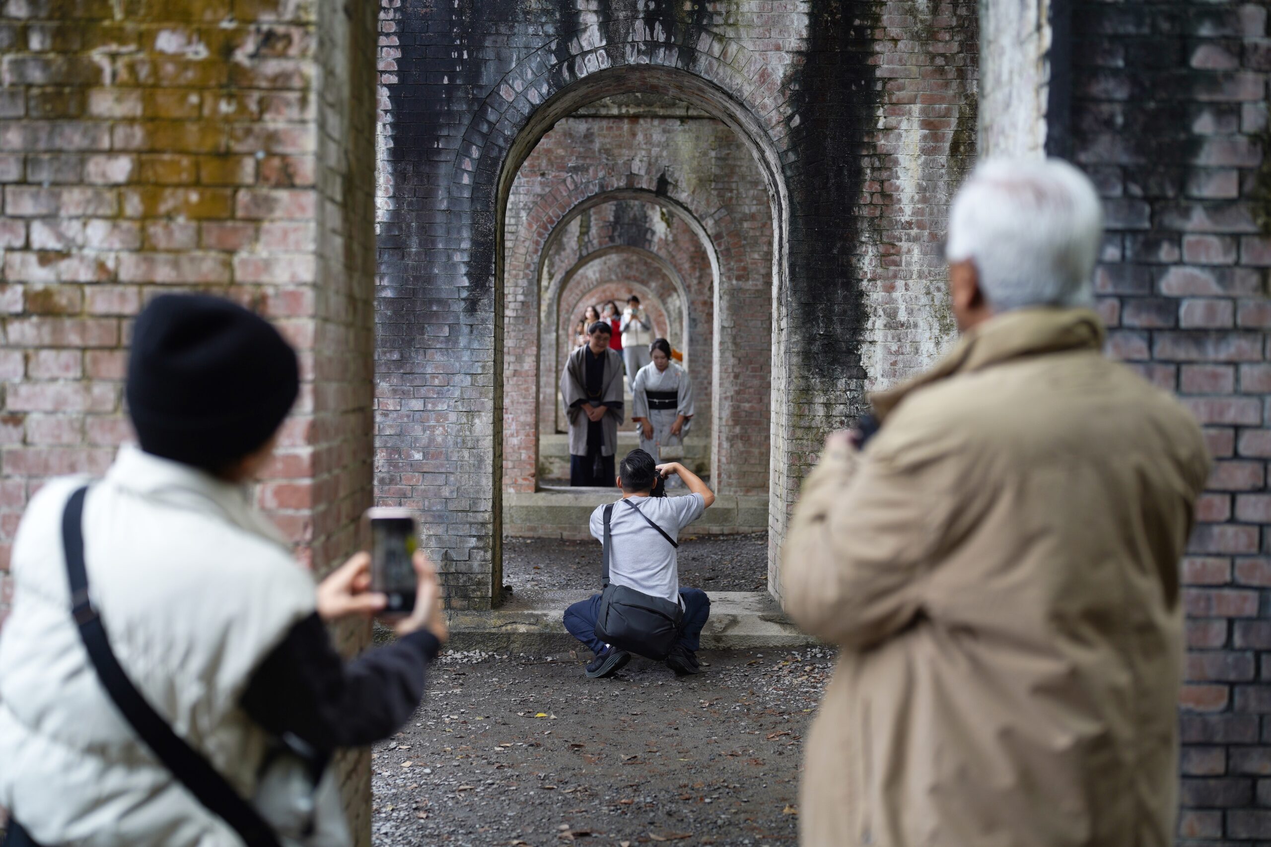 南禅寺にある水楼閣でかなり人気の撮影スポットです。アーチ状のレンガで抜け感のある撮影ができます。F2で撮影した作例で中央でカメラを構えている人にピントをあわせています。