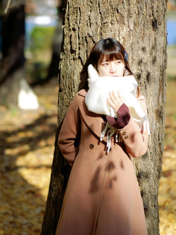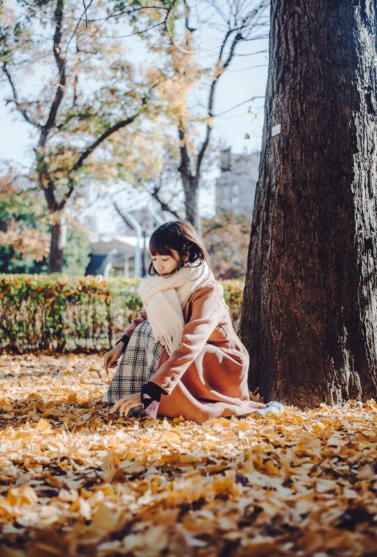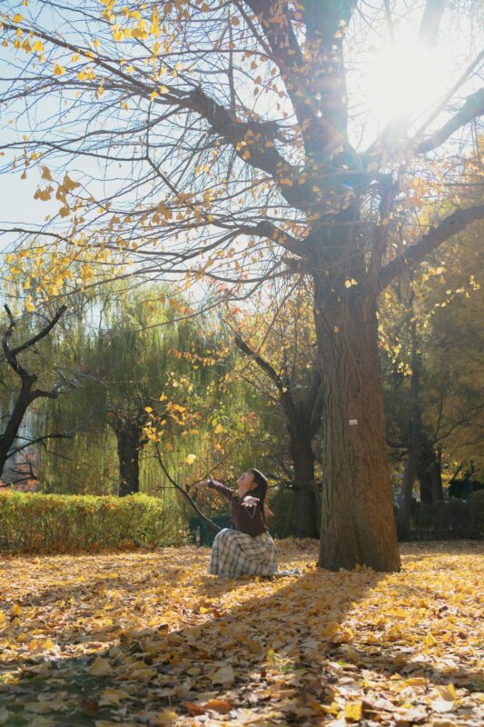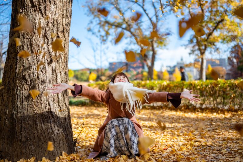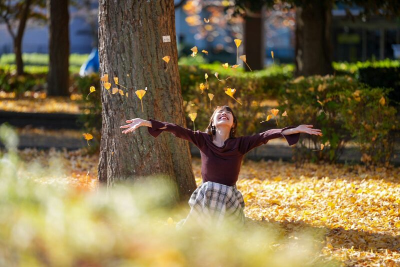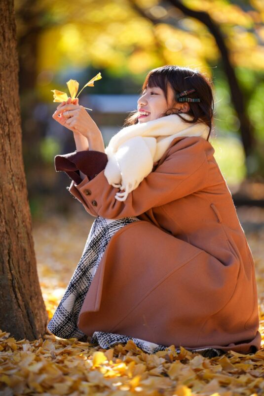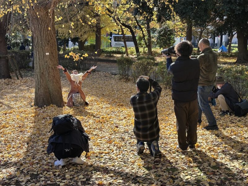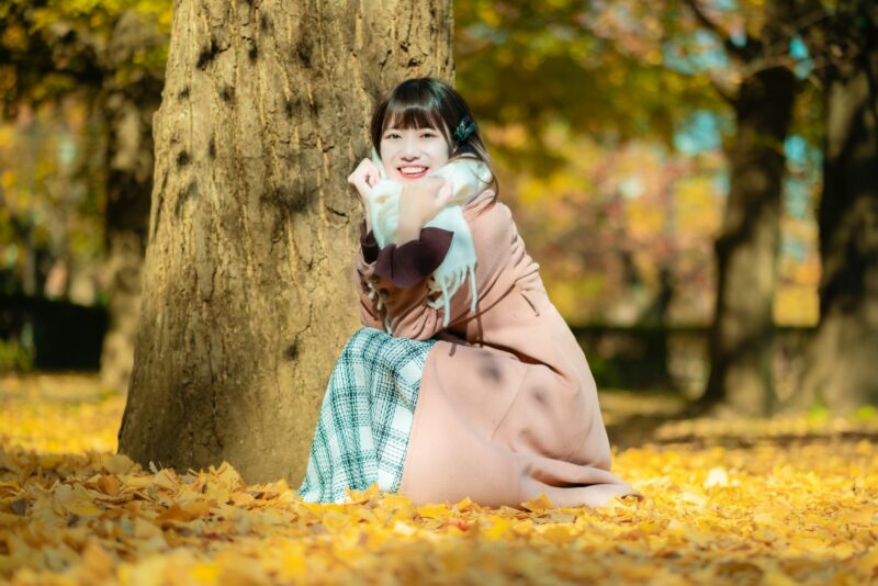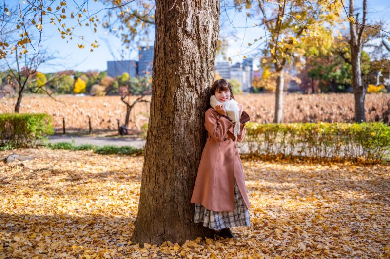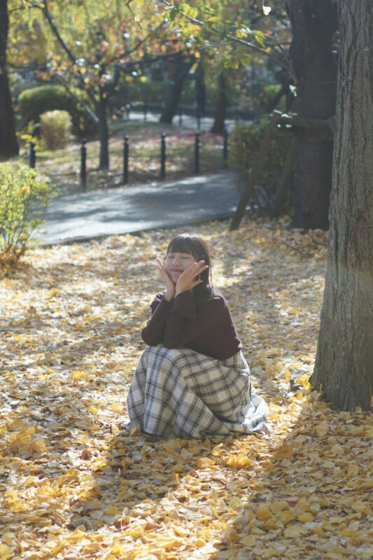 前半の撮影場所は 黄色い葉が地面に敷き詰められたイチョウの木の下 に決定。