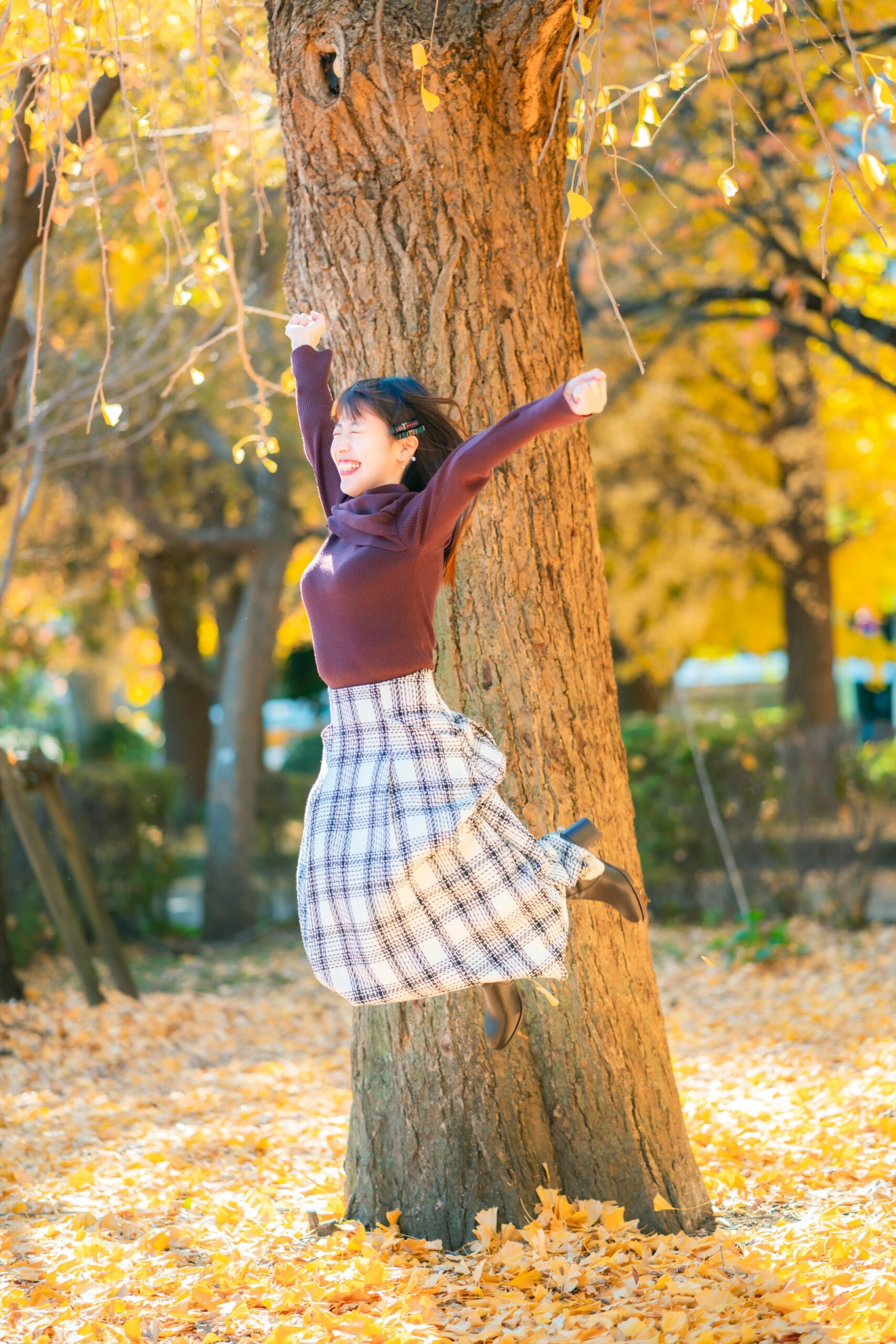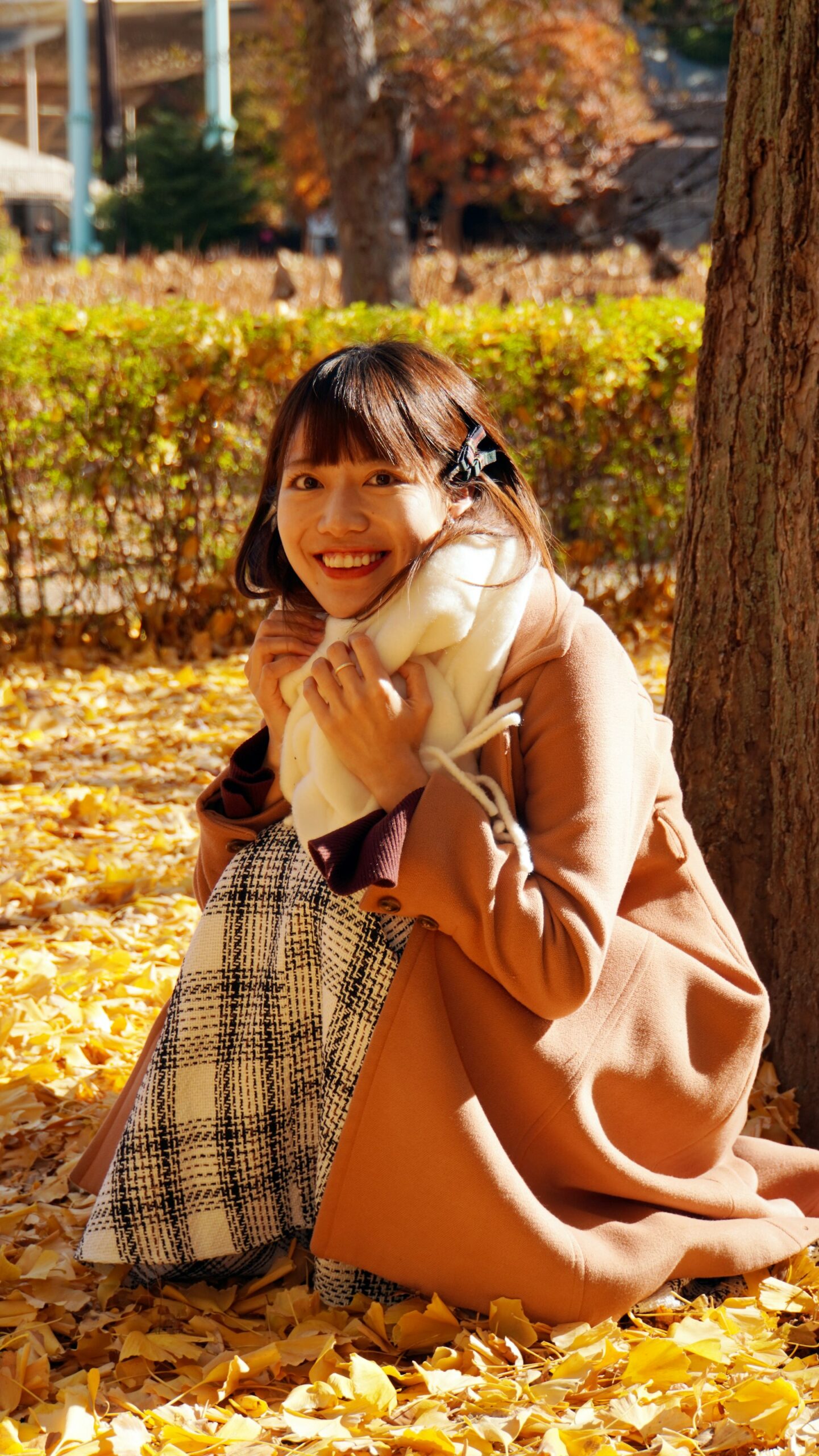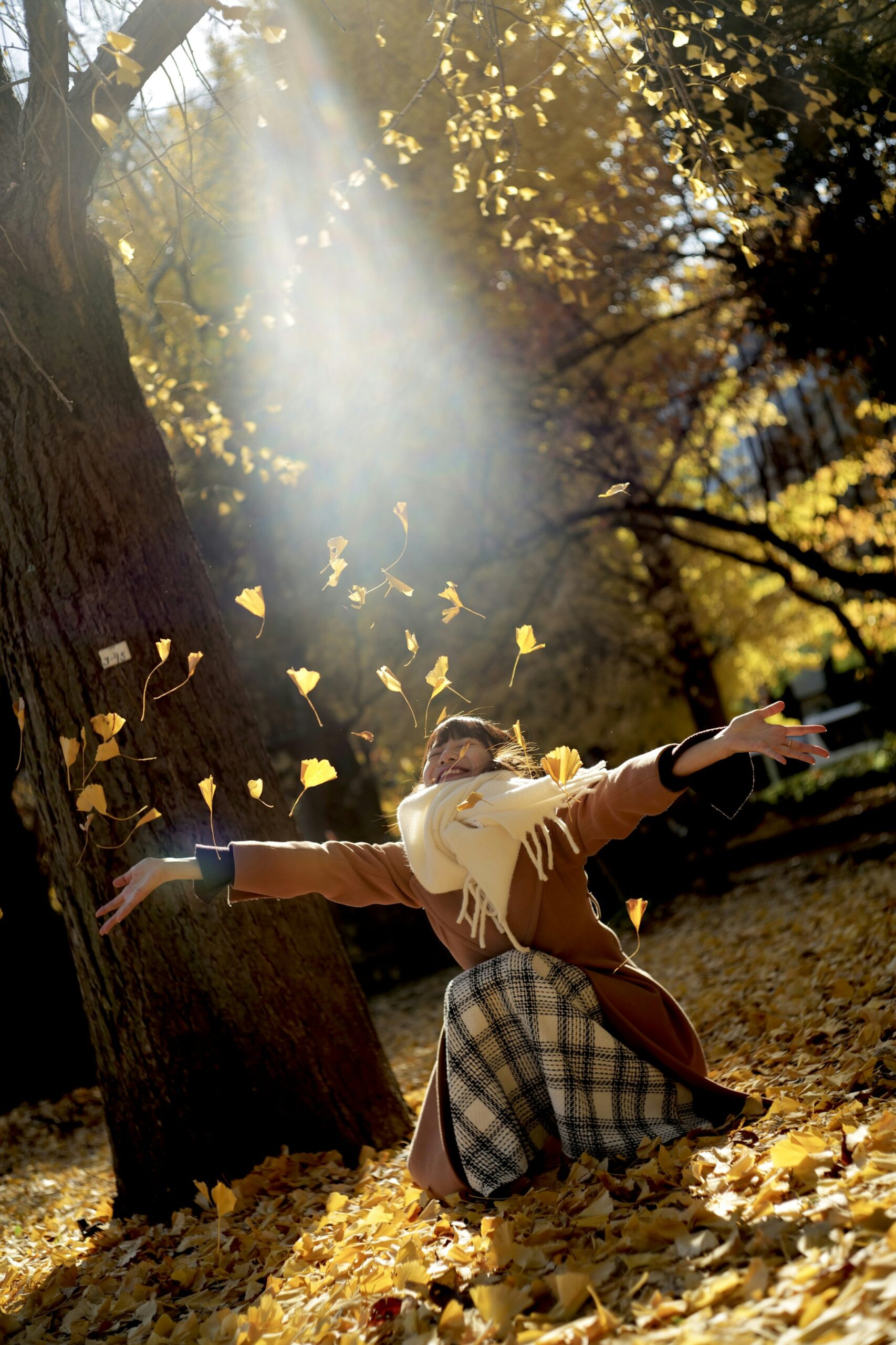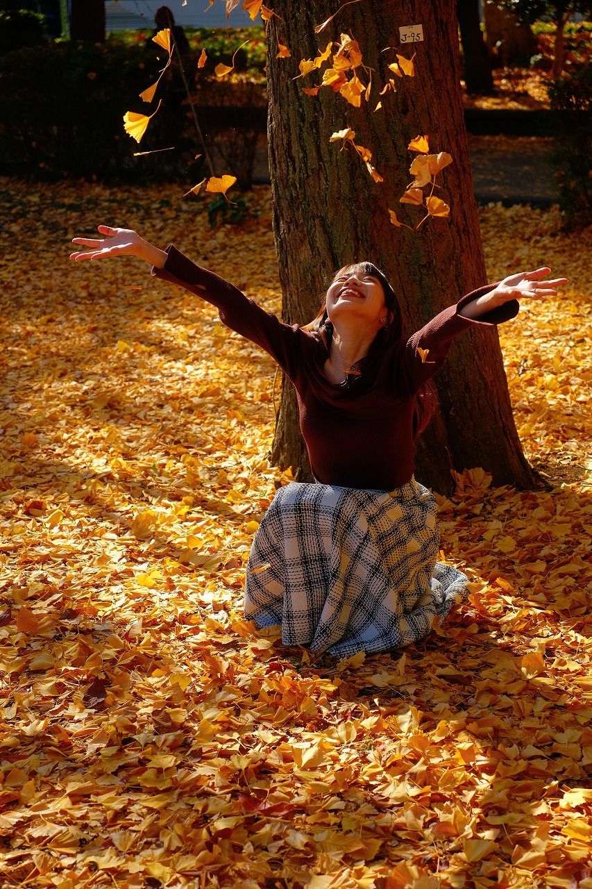 前半の撮影場所は 黄色い葉が地面に敷き詰められたイチョウの木の下 に決定。