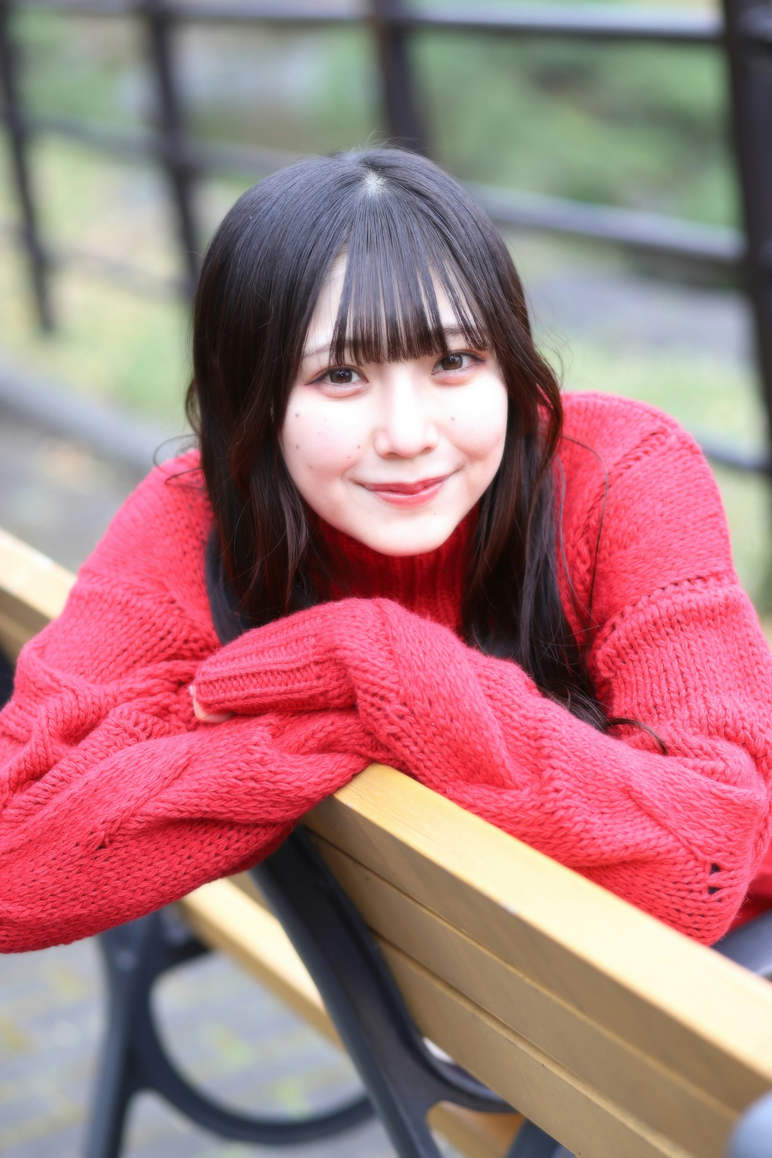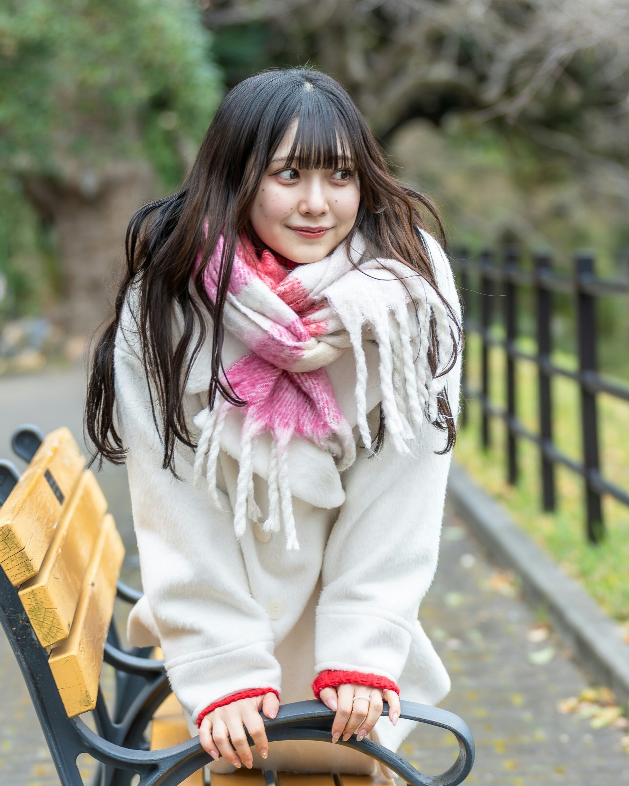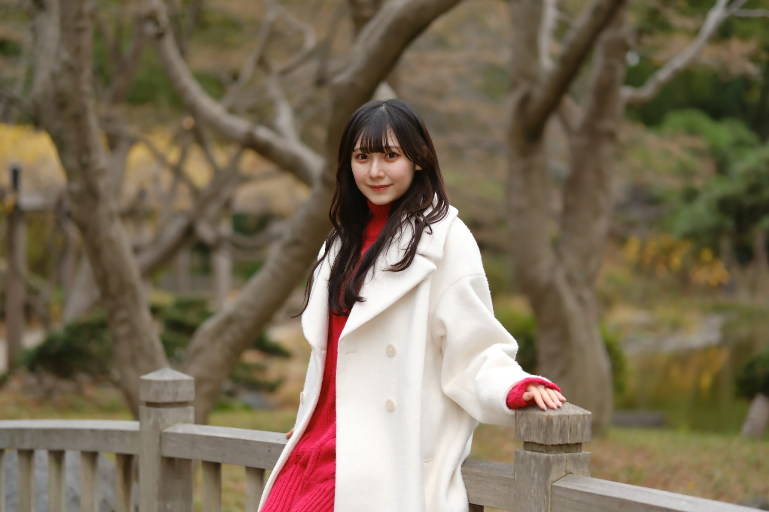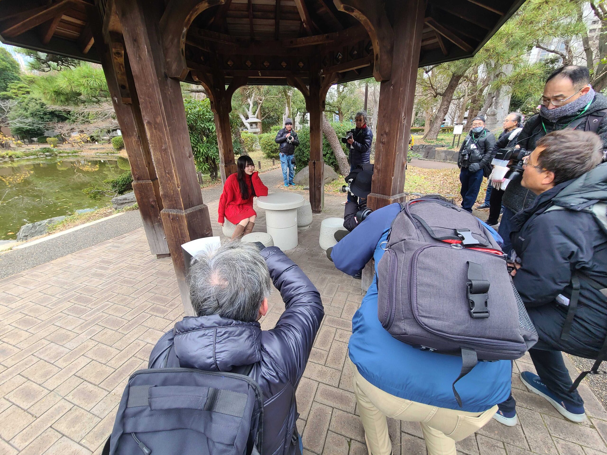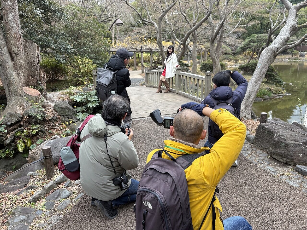 まずは集合場所から歩き、公園内の橋のあるスポットへ。橋の上に立つさくらさんをモデルに、