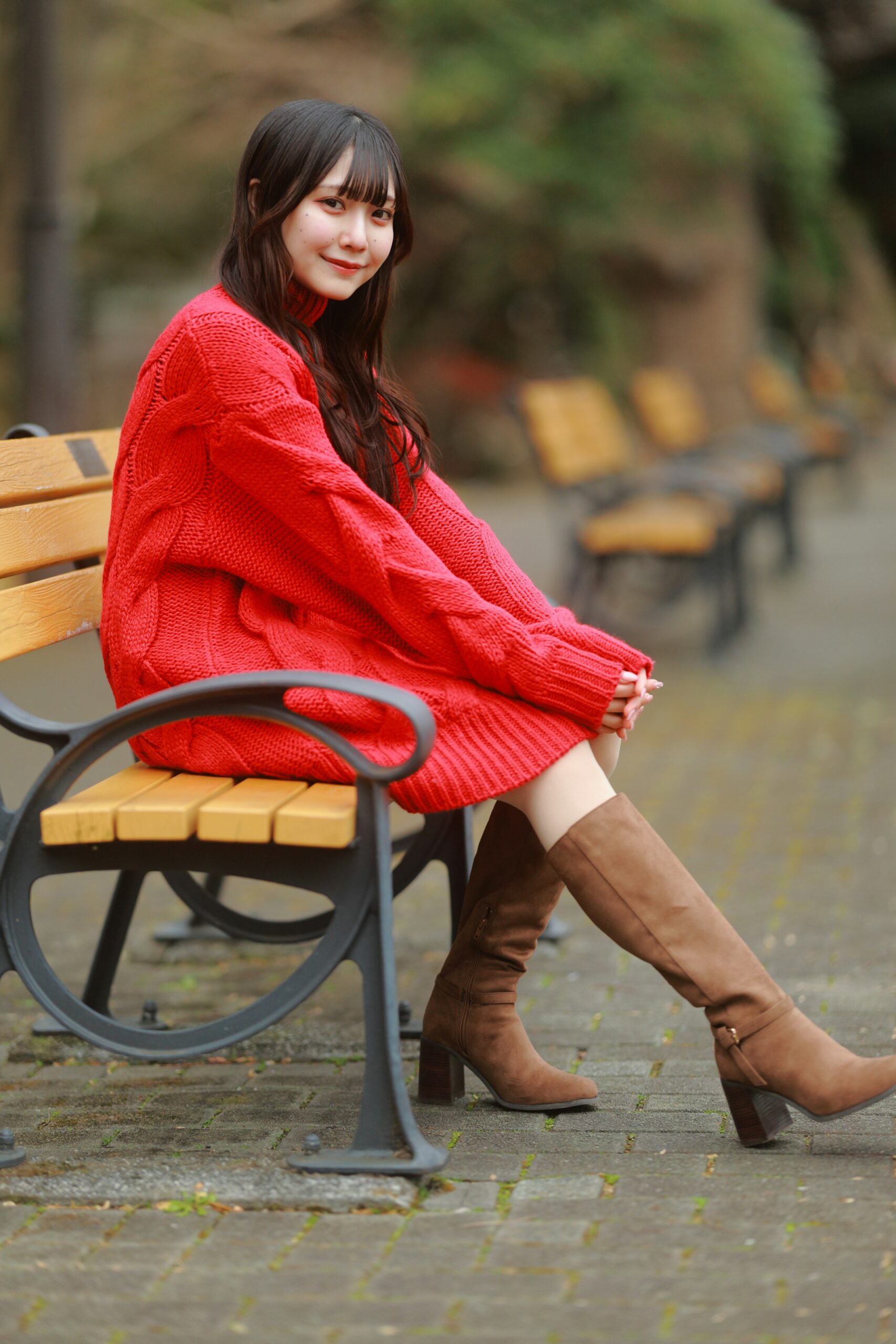 さらに場所を変え、椅子に座ったポーズや、赤く色づいた樹木、イチョウの落ち葉と一緒に撮影を行いました。