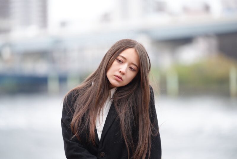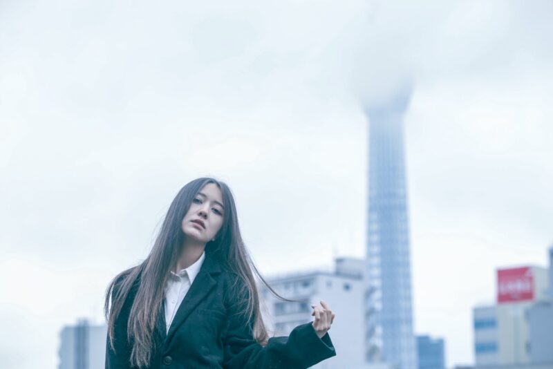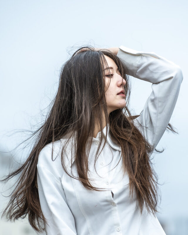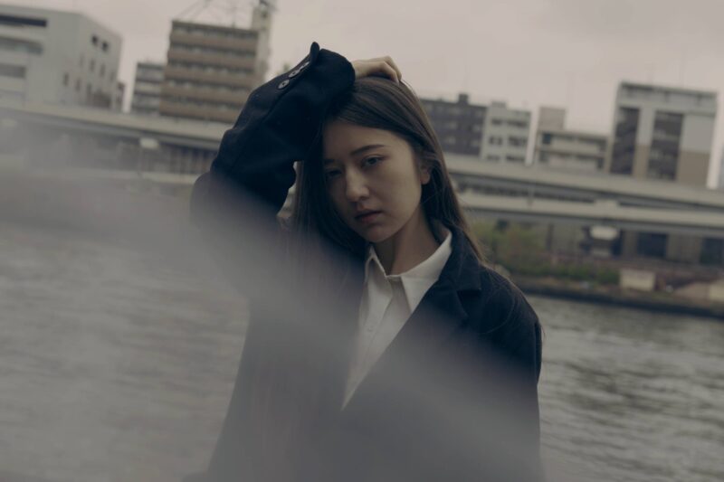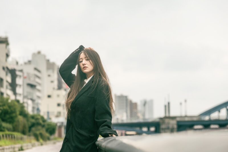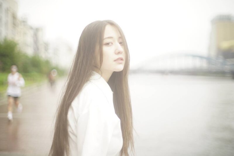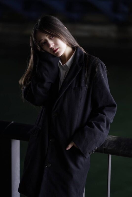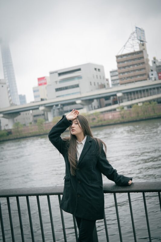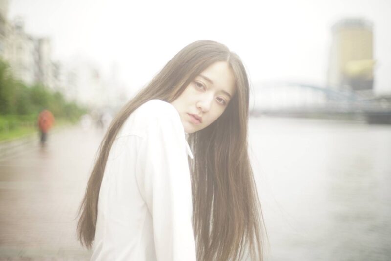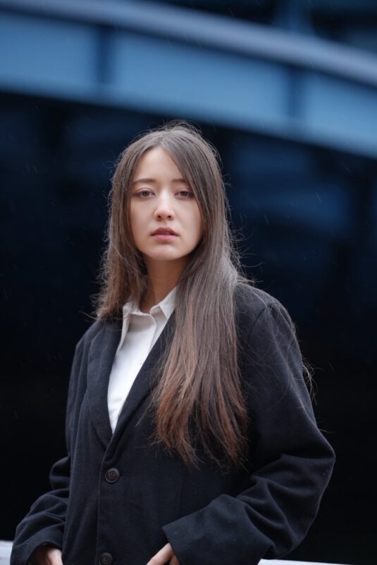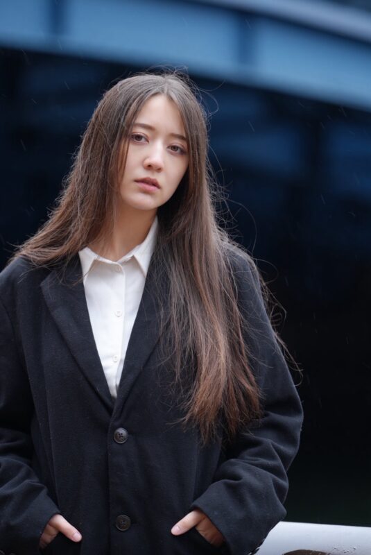 モデルの木村ユリヤさん。雨の中でも柔らかい表情でカメラを惹きつける。