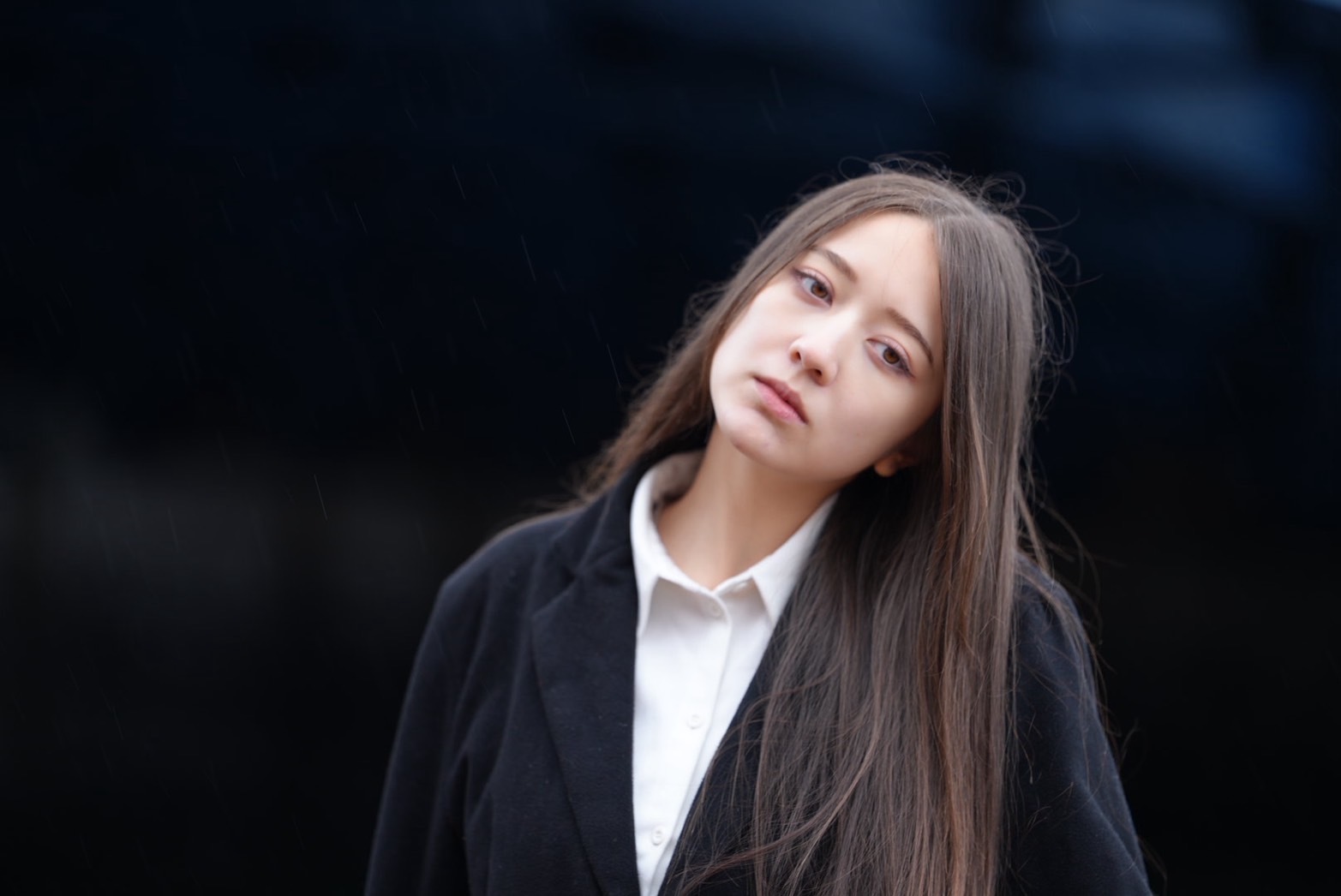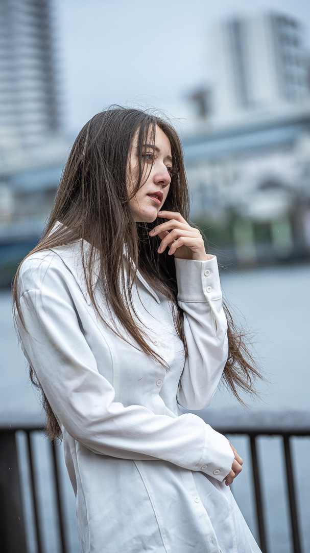 モデルの木村ユリヤさん。雨の中でも柔らかい表情でカメラを惹きつける。