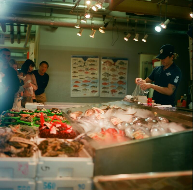 今度は、市場の中を写してみました。魚の赤色が綺麗に映えています。