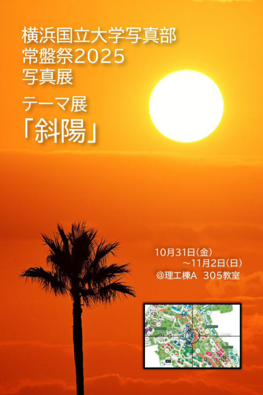部員のお気に入りの写真を自由に展示する自由展に加えて、テーマ展「斜陽」も開催いたします。しおり等のグッズや中古カメラ、レンズの販売も行う予定です。
