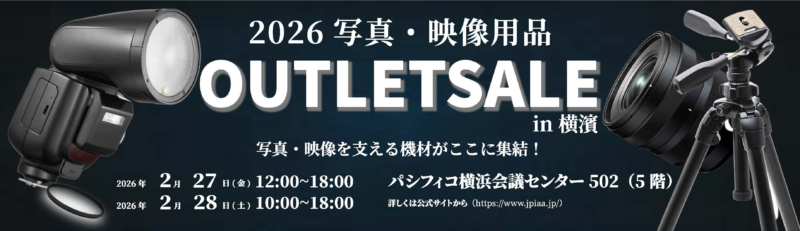 「2026 写真・映像用品アウトレットセールin横濱」は、CP+2026の会期に合わせて開催される写真・映像用品の特別販売イベントです。一般社団法人日本写真映像用品工業会に加盟する13社が出展し、化粧箱不良などの「訳ありの新品」がアウトレット価格で販売されます。