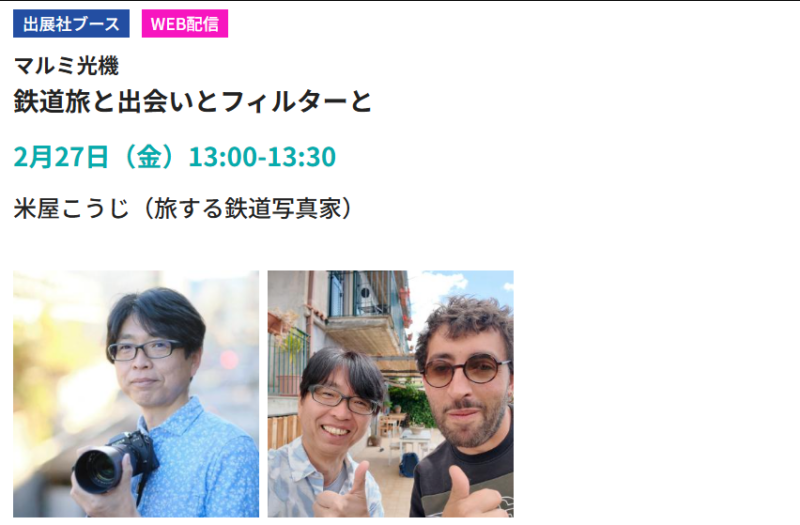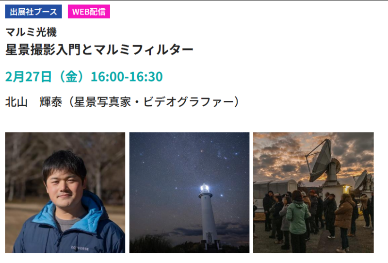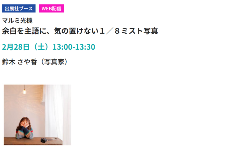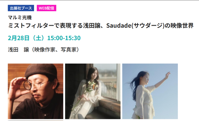 マルミ光機ブースでは、会期中、著名な写真家や映像作家を招いたステージイベントが多数開催されます。