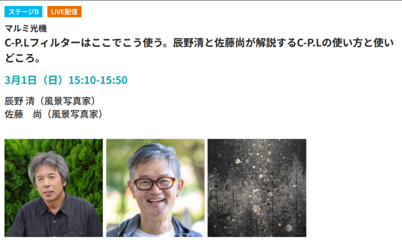 ルーク・オザワ氏、米屋こうじ氏、浅田譲氏、辰野清氏、佐藤尚氏といった写真・映像界の第一線で活躍するプロフェッショナルたちが、新製品の魅力やフィルターワークの秘訣を解説します。彼らの作品を交えながら、フィルターが写真や映像表現にどのような変化をもたらすのかを深く学ぶことができるでしょう。