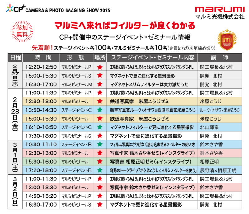 新フラッグシップ「PRIME PLASMA SPUTTERING C-P.L」の圧倒的な性能を体験し、FOCUS AID、StarScapeKIT、ミストシリーズ、VARIABLE ND、パンチシリーズ、MOVIEKITなど、あなたのクリエイティブな表現を広げるフィルターの数々を実際に手に取って試すことができます。ステージイベントでプロの技を学び、アウトレットセールでお得に製品を手に入れるチャンスも活用して、2026年の写真・映像体験をマルミ光機と共に新たな次元へと進化させましょう。