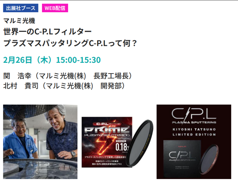 CP+2026のマルミ光機ブースでは、最先端の技術を駆使したフラッグシップC-P.Lフィルターの発表から、多種多様な最新・定番フィルターの展示、そして豪華フォトグラファーによるステージイベントまで、写真・映像愛好家にとって見逃せないコンテンツが満載です。
