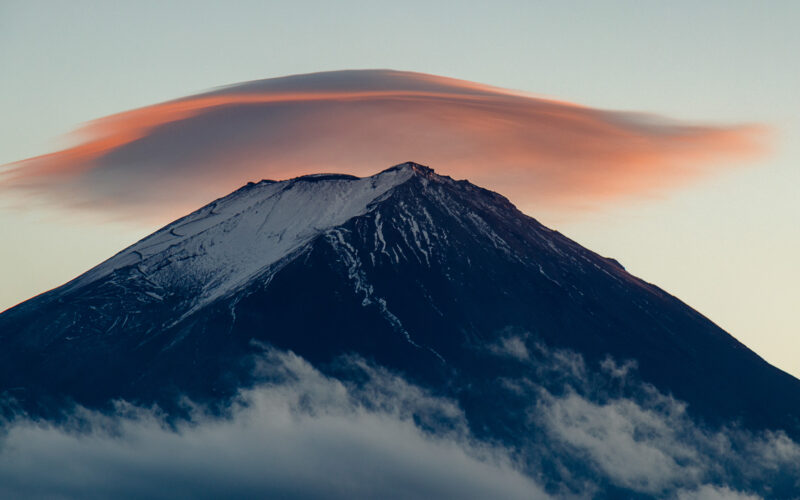 朝焼けに染まる笠雲が富士山にかかった瞬間の写真です。