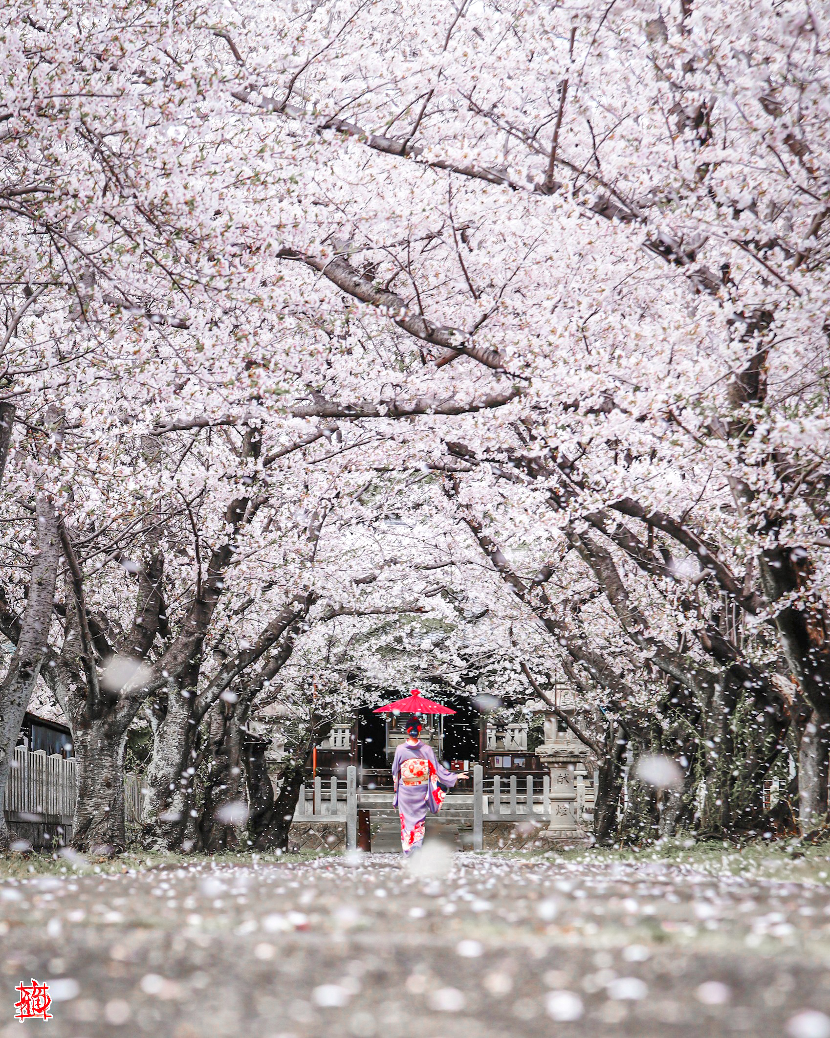 「ただでさえ難しい桜吹雪を、遠隔シャッターでタイミングを合わせ、リモコンを袂に隠し、強風のなか和傘を持ってポージング…