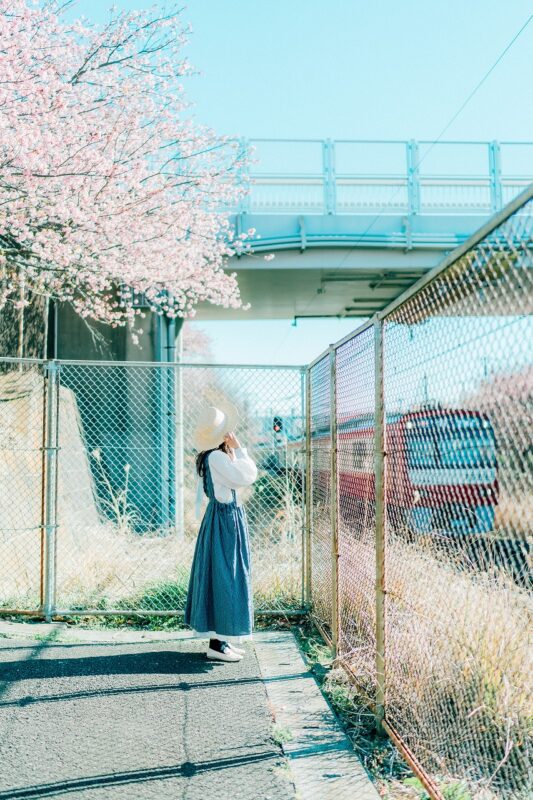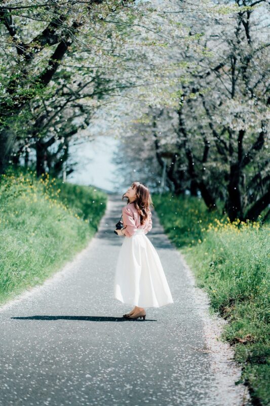 桜が揺れる春の風、髪の動き、そして被写体が自然に溶け込む情景。