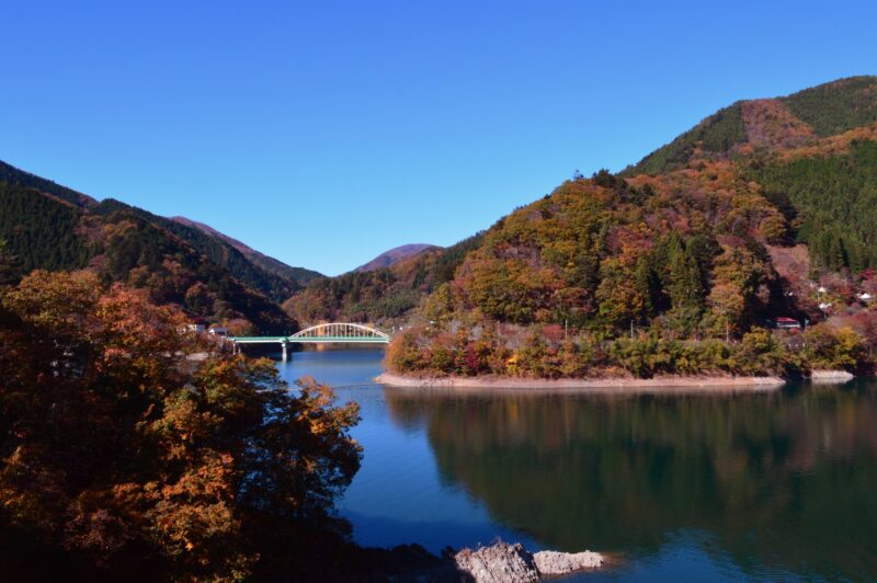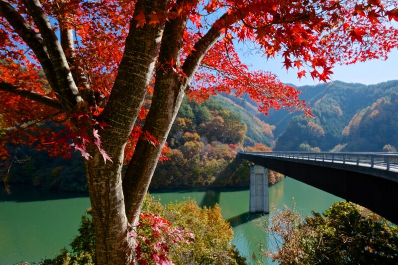 箕輪ダムによってできた湖で、紅葉と青い湖面とのコントラストが魅力です。