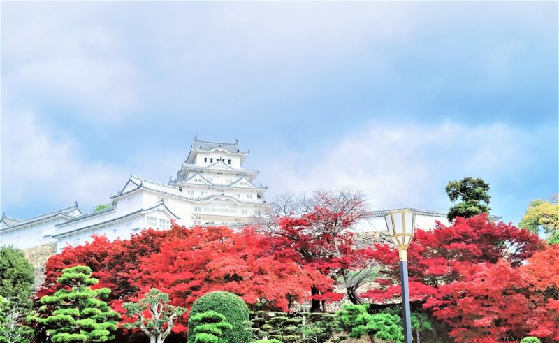 白い城郭と紅葉のコントラストが美しい景色を作り出します。