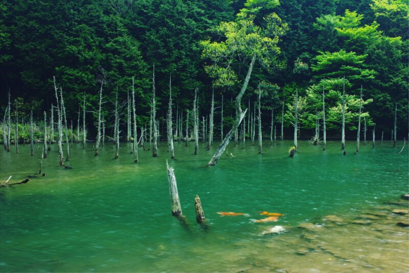水没林が神秘的な池に映り込み、紅葉とのコントラストが美しい秘境です。