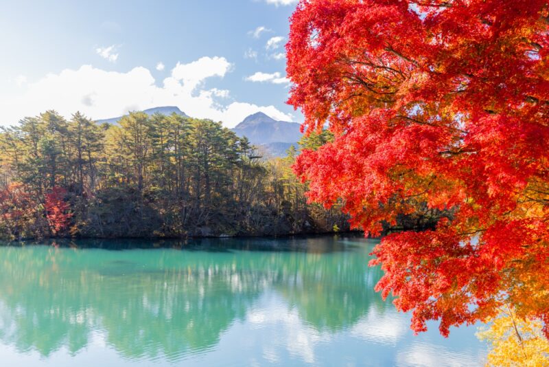磐梯山の噴火でできた大小様々な湖沼が点在し、季節や天候によって水の色が変化します。特に「るり沼」は透明度が高く、エメラルドグリーンの水面が魅力的です。