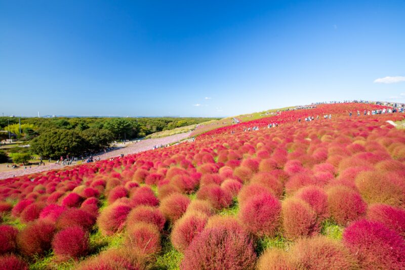 秋にはコキアの紅葉が「みはらしの丘」一面を真っ赤に染め上げます。