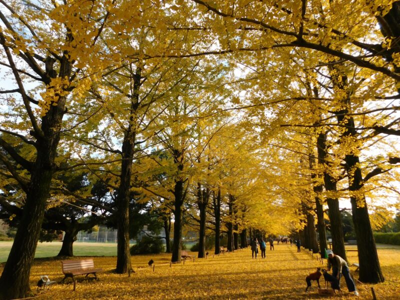 園内のイチョウ並木は黄金色のトンネルを作り出します。