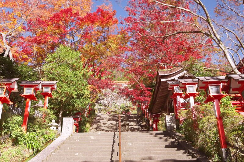 多種多様な木々が境内や参道を真っ赤に染め上げる、九州屈指の紅葉名所です。