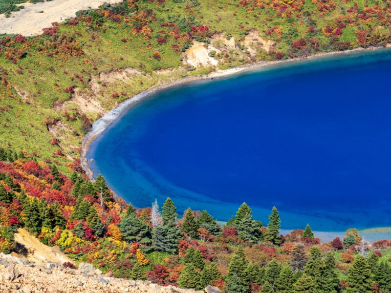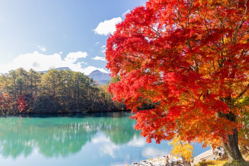 五色沼:磐梯山の噴火によって作られた大小30ほどの湖沼群で、季節や天候によってコバルトブルーやエメラルドグリーンなど色彩が変化する「神秘の湖沼」です。るり沼は特に透明度が高く、エメラルドグリーンの水面に森の緑や空の色が映り込みます。紅葉の見頃は10月中旬から11月上旬です。