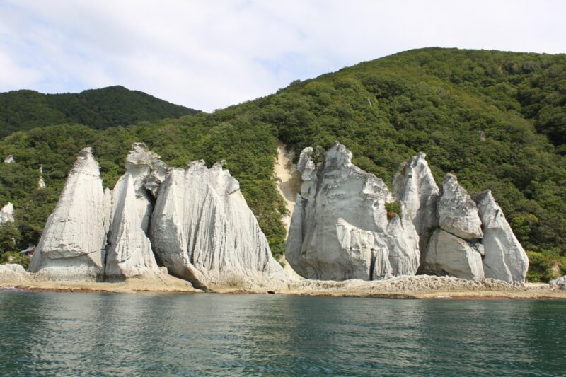 仏ヶ浦:下北半島の斧の刃にあたる海岸線に、大昔の海底火山活動と長年の浸食によって形成された白い巨岩や奇岩が約2kmにわたって連なります。エメラルドグリーンの海とのコントラストが異世界のような景観を作り出し、観光船からの撮影もおすすめです。
