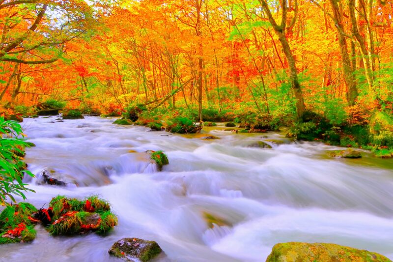 十和田湖から流れ出る奥入瀬渓流は、年間を通して美しい景観が楽しめますが、10月下旬から11月上旬にかけての紅葉シーズンは特に人気です。ブナ、カエデ、ヤマモミジなどが色づき、躍動感あふれる渓流美と見事に調和します。焼山から子ノ口までの約14kmに点在する滝などを、トレッキングしながら撮影するのがおすすめです。