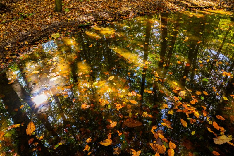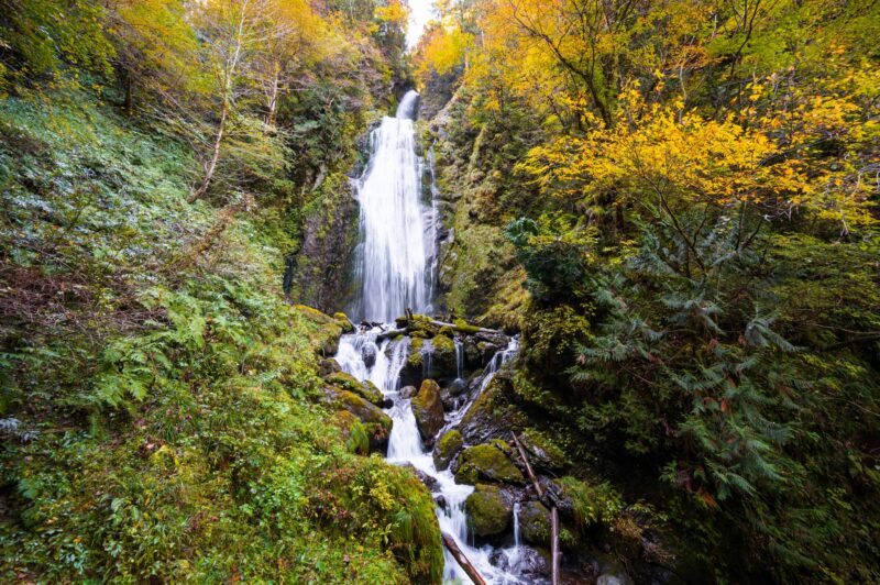 青森県南西部から秋田県北西部にかけて広がる白神山地は、世界最大級のブナの原生林を誇る世界自然遺産です。10月中旬から下旬にかけては、ブナやカエデ、ヤマモミジなどが色づき、暗門の滝では迫力ある滝と黄金色のブナの共演が見られます。大小33の湖沼群・十二湖では、青く澄んだ青池と紅葉の神秘的な風景を撮影できます。