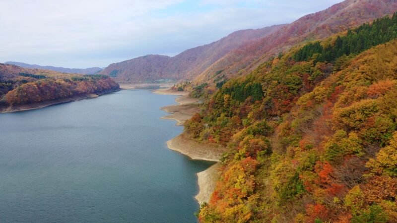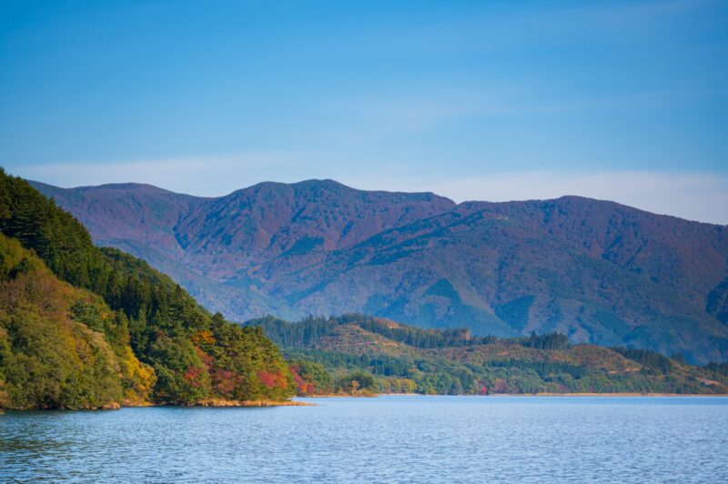 錦秋湖:湯田ダムによって作られた人造湖で、周囲の山々の紅葉が湖面に映る様は「錦」のように美しいと称されます。10月中旬から11月上旬が見頃で、サイクリングしながらの撮影もおすすめです。