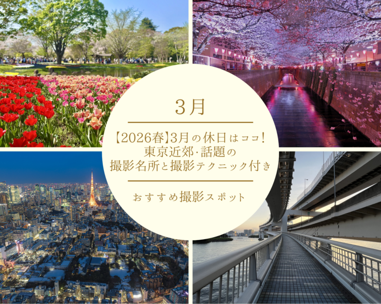 3月の東京近郊撮影の魅力 3月は冬の寒さが和らぎ、春の訪れを感じさせる季節です。梅や桃、桜といった花々が咲き始め、街は色鮮やかな景色に変わります。この時期の東京近郊は、自然の美しさから都会のランドマーク、そしてSNS映え … 続きを読む 【2026春】3月の休日はココ!東京近郊・話題の撮影名所と撮影テクニック付き