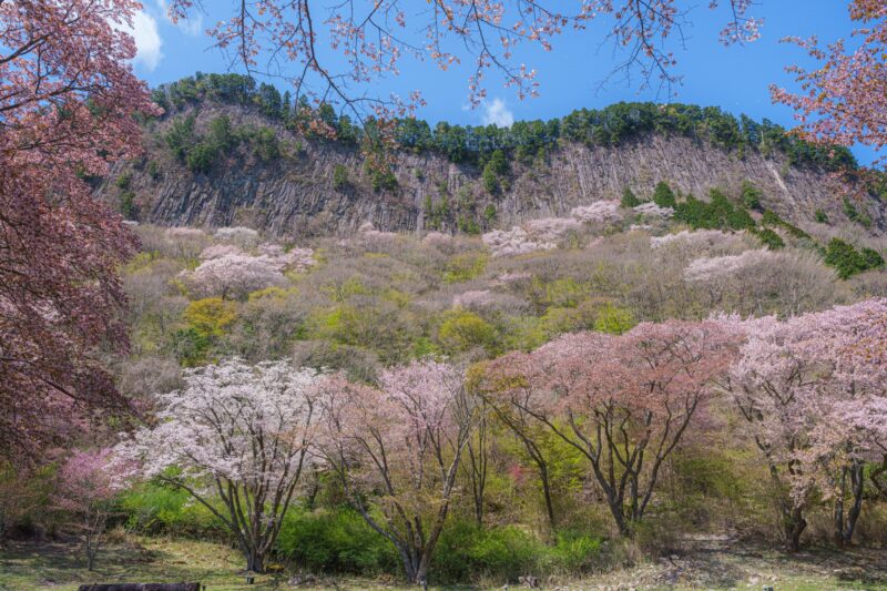 高さ約200m、幅2kmの屏風のような岸壁がそびえ立つ屏風岩。春には樹齢100年を超える約300本の山桜が咲き誇り、岩と花のコラボレーションが絶景です。近畿で一番開花の遅い桜とも言われ、毎年4月中旬から下旬に満開を迎え、ミツバツツジなどとの共演も見事です。