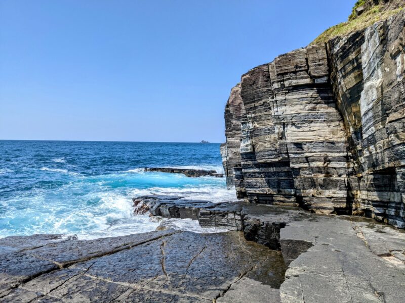 約1,400万年前のマグマの熱によって形成された変成岩地形で、灰白色と黒色の縞模様が織りなす雄大な景観は日本の地質百選の一つです。