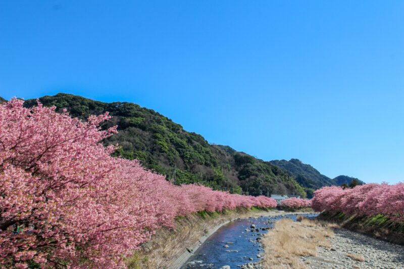 早春を告げる濃いピンク色の河津桜は、伊豆半島の東側を流れる河津川沿いに約8,000本が植えられています。2月下旬から3月上旬にかけて満開を迎え、一足早い春の訪れを感じさせてくれます。