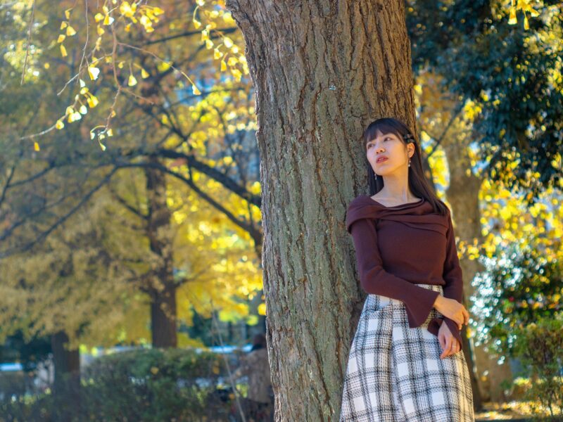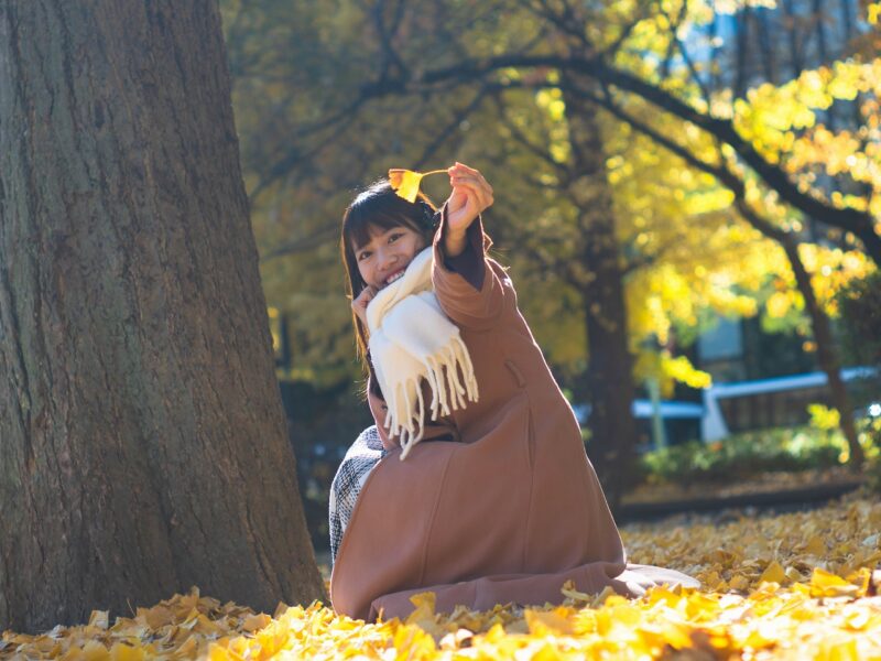 ポーズはイチョウの葉を手に取ってもらうことで楽しげな雰囲気に。公園には落ち葉など、ポートレートを彩るアイテムが多くあるため、ぜひ探してみてください。