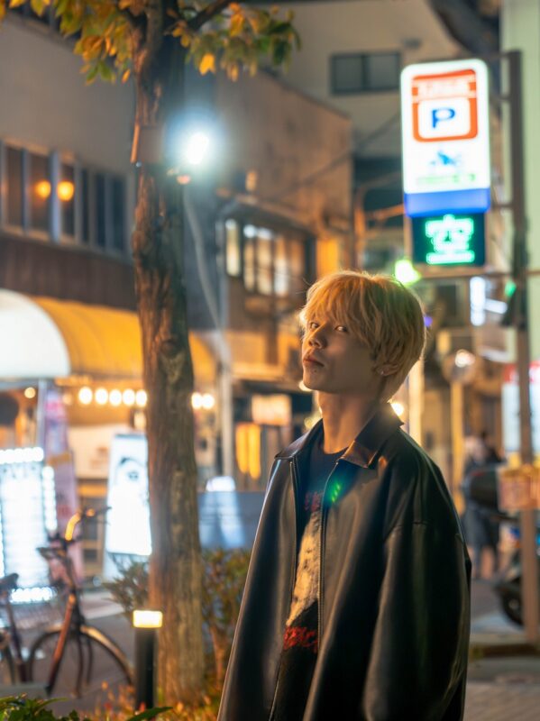 後ろの街灯をスポットライトのように見立て、逆光で被写体の顔の半分を影にすることで、表情を活かしたアンニュイな雰囲気に仕上げました。
