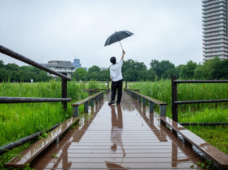 雨の日のポートレートは、地面の水たまりで人物を反射させる「リフレクション」を狙ってみましょ