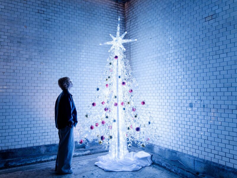 白いライトアップが目を引くクリスマスツリー。周辺が暗く光源が強いシーンでは、逆光で人物をシルエットにするのがおすすめです。背景の明るさに露出を合わせると人物の輪郭が浮かび上がり、存在感を際立たせることができます。