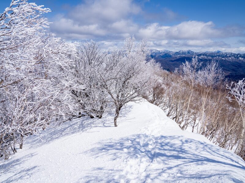 赤城山の稜線に広がる雪景色を、α7R IVとGM 24-70mmを24mmで撮影。真っ白な霧氷の枝と青空、その奥に連なる山々までを一枚に収めることができるのは広角ならでは。6100万画素の解像度が雪面の質感や木々の細部まで描き出し、登山のスケール感と臨場感をそのまま残せました。