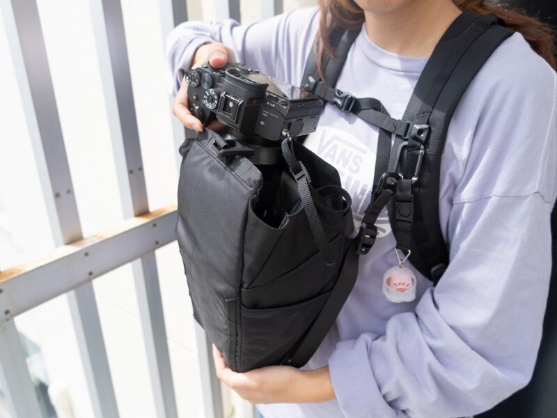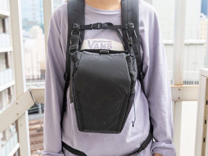 一方で、胸の前にカメラバッグがあるため、下を向いたときに足元が見えづらくなるというデメリットも。岩場や急登では注意が必要です。