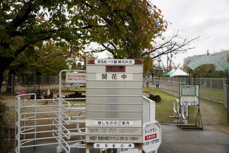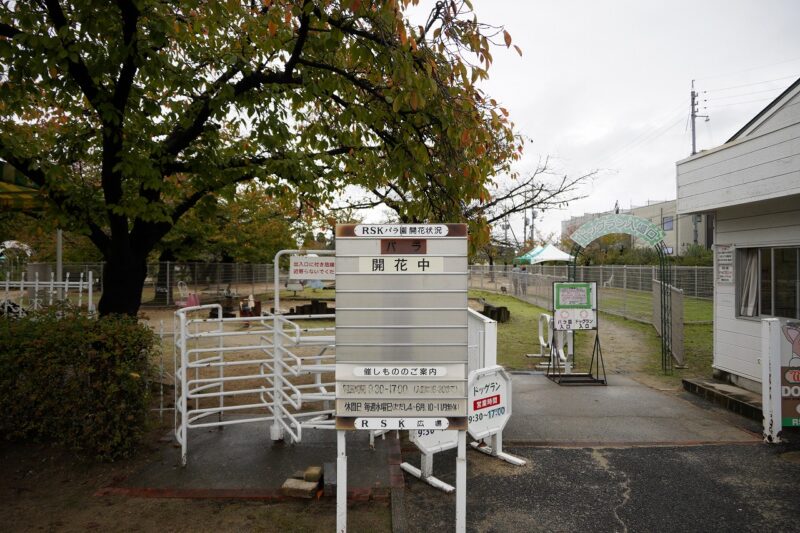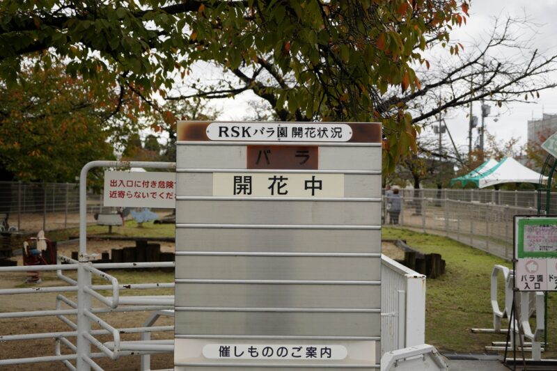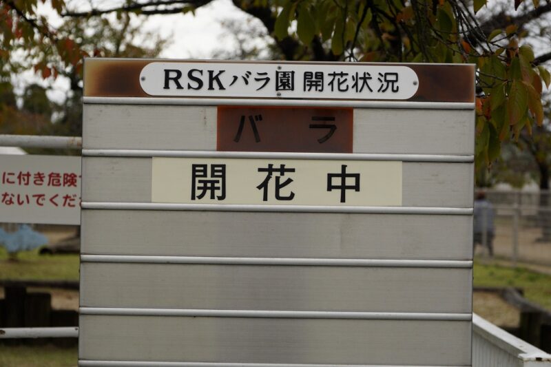 カメラから看板までは2mくらいでしょうか。広角端の16mmでは右側のドッグランの看板や左の木まで広く写っています。3枚目の35mmになれば、フルサイズ換算52.5mmとなり、かなり自然で程よい距離に感じます。100mmまで行くと看板以外の情報は写らなくなり、望遠端300mmでは「開花中」の文字さえも切れてしまうほど拡大されました。