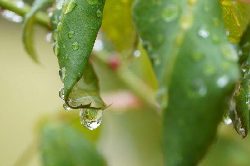 作例では、葉の先端の水滴にピントを合わせました。雨上がりだったので、葉っぱには多く水滴がついておりとても綺麗でした。