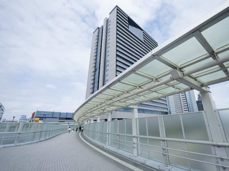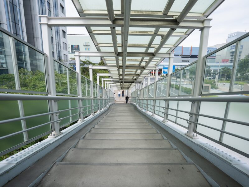 14mmという超広角域では、わずかな歪みによって写真の印象が左右されます。駅に続く連絡階段を正面から捉えたこの作例は、階段や手すり、柱、天井の直線が、歪みなくまっすぐに描写されました。