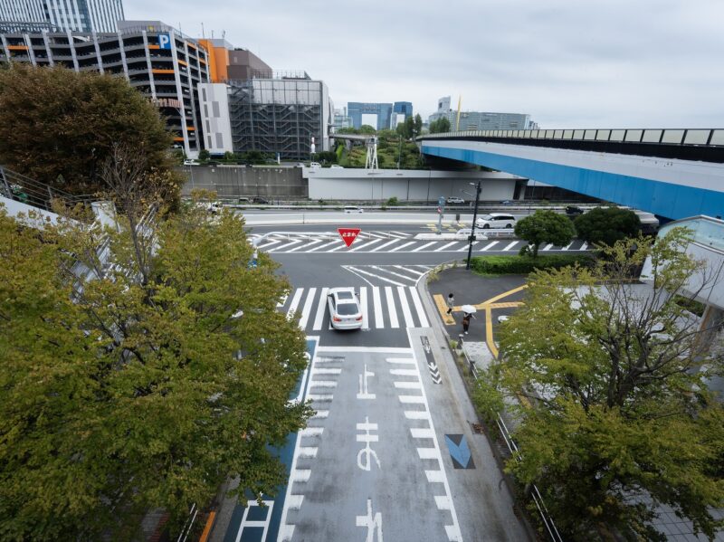 歩道橋の上から道路を見下ろしたカット。直線や曲線の建造物が入り混じる、都会ならではの風景です。