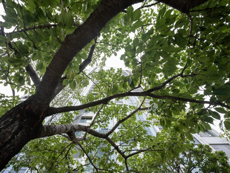 高層ビルを背景に、都会で大きく育つ樹木を撮影しました。14mmのパースペクティブを活かせば、